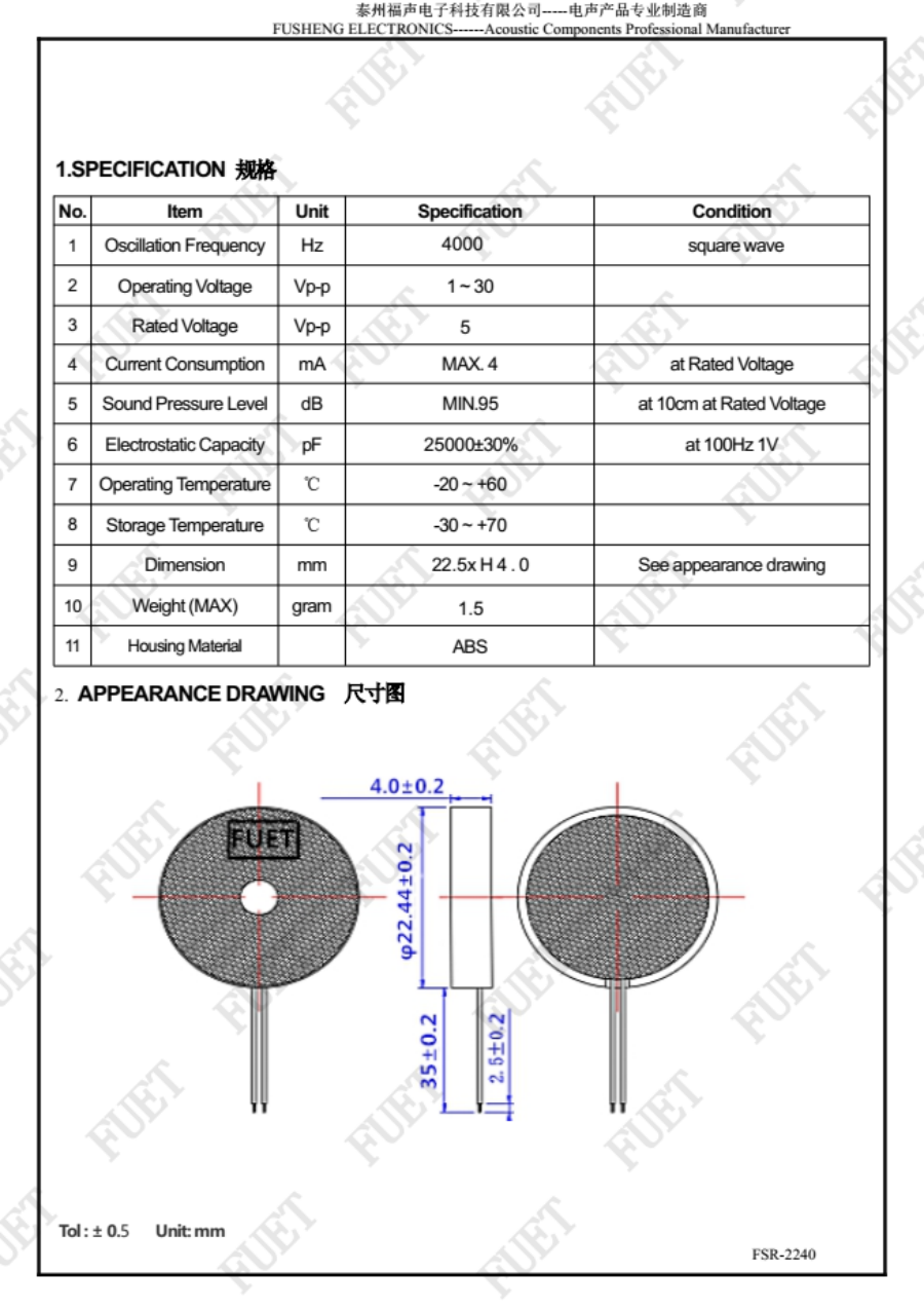 引线35MM压电式无源蜂鸣器接FSR-2240-L35
